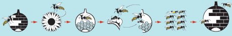 Most people think of wasps or yellowjackets as being a nuisance or pest, especially around barbecues, picnics, beer gardens, ice cream, cake and fruit stalls and fruit trees. What is surprising is the number of people who live in fear of these insects. It is estimated that between 4 to 8 out of every 1000 people are at serious risk from wasps. Many hundreds and possibly even thousands of people die each year as a result of an allergy to a wasp sting. Even in people who do not have an allergy, wasp stings can be a problem. A mature wasp will almost always have a poison sack that is swarming with bacteria. If stung by such a wasp there is a real risk of severe infection and a painful wound. Furthermore, it is not only people that are affected! Countless numbers of household pets are stung each year by wasps. Apart from the fact that wasps sting and bite, they can also cause other problems. Because wasps scavenge in faeces, they are prime carriers of disease especially where they come into contact with human food. Wasps will attack bee hives and kill bees. In late summer and throughout autumn, wasps do untold damage to fruit crops. During nest building, wasps cause damage to timber and trees which they use for making their wood pulp paper nests. the wasp lifecycle